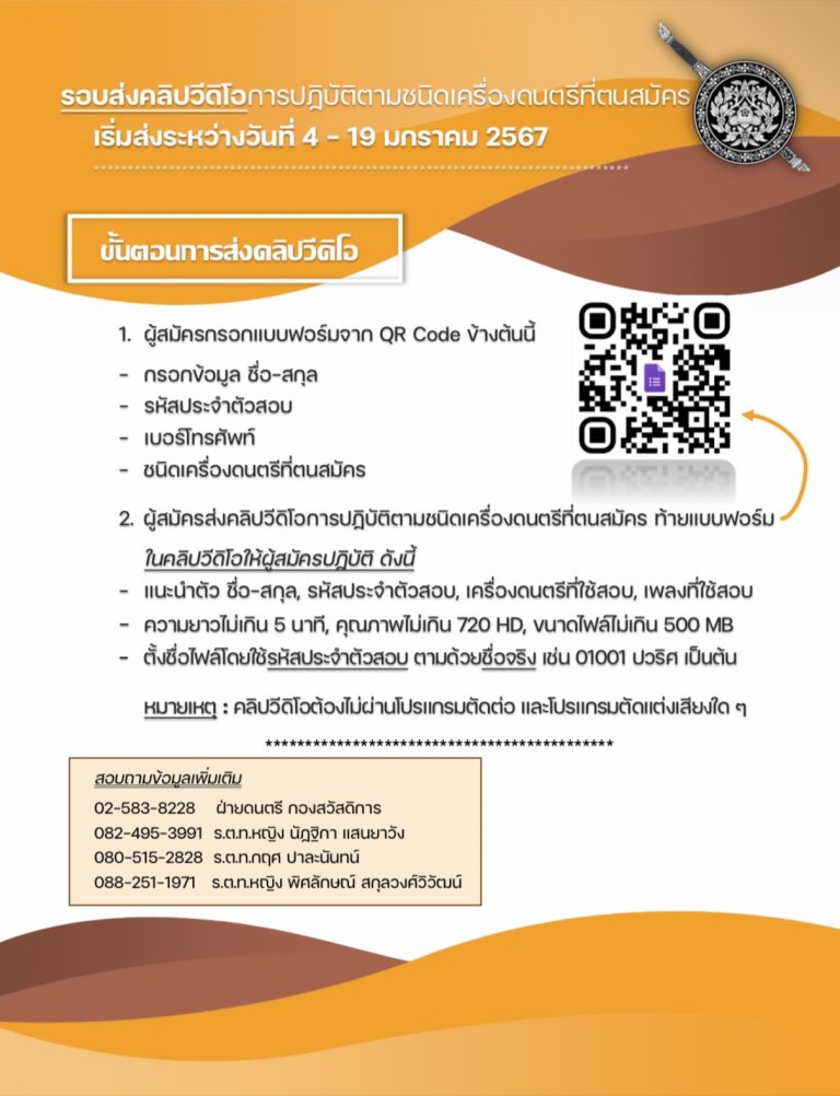 ผู้สมัครส่งคลิปวีดิโอการปฏิบัติตามชนิดเครื่องดนตรีที่สมัคร 4-19 ม.ค. 67